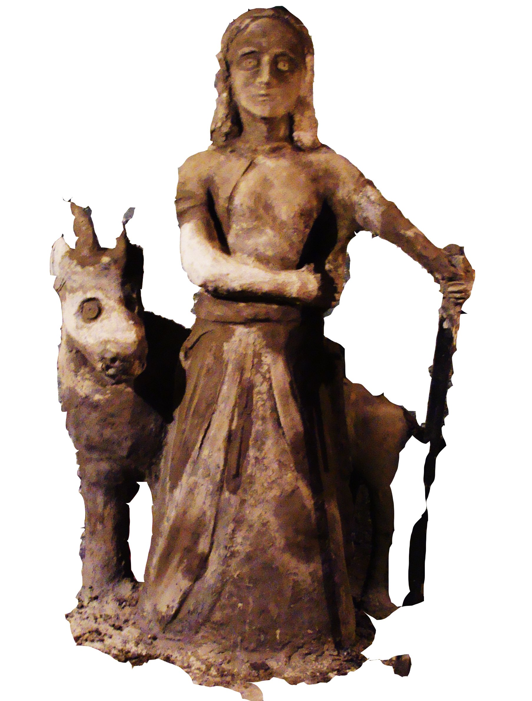 The sculpture is crafted from clay plaster, circa 2001–2003. It depicts a figure holding a bird in its hand.