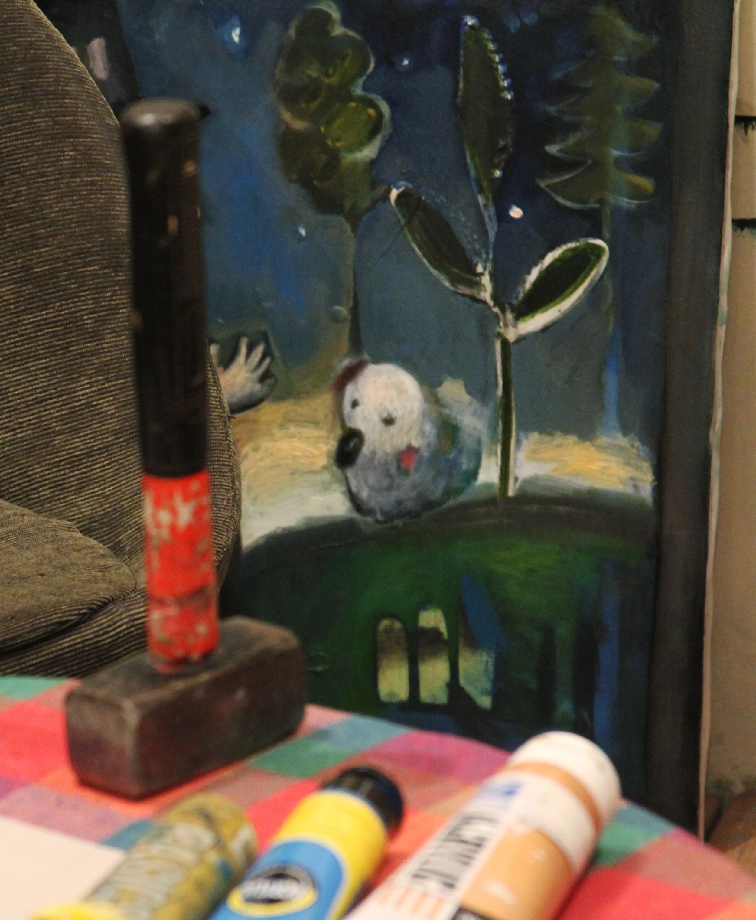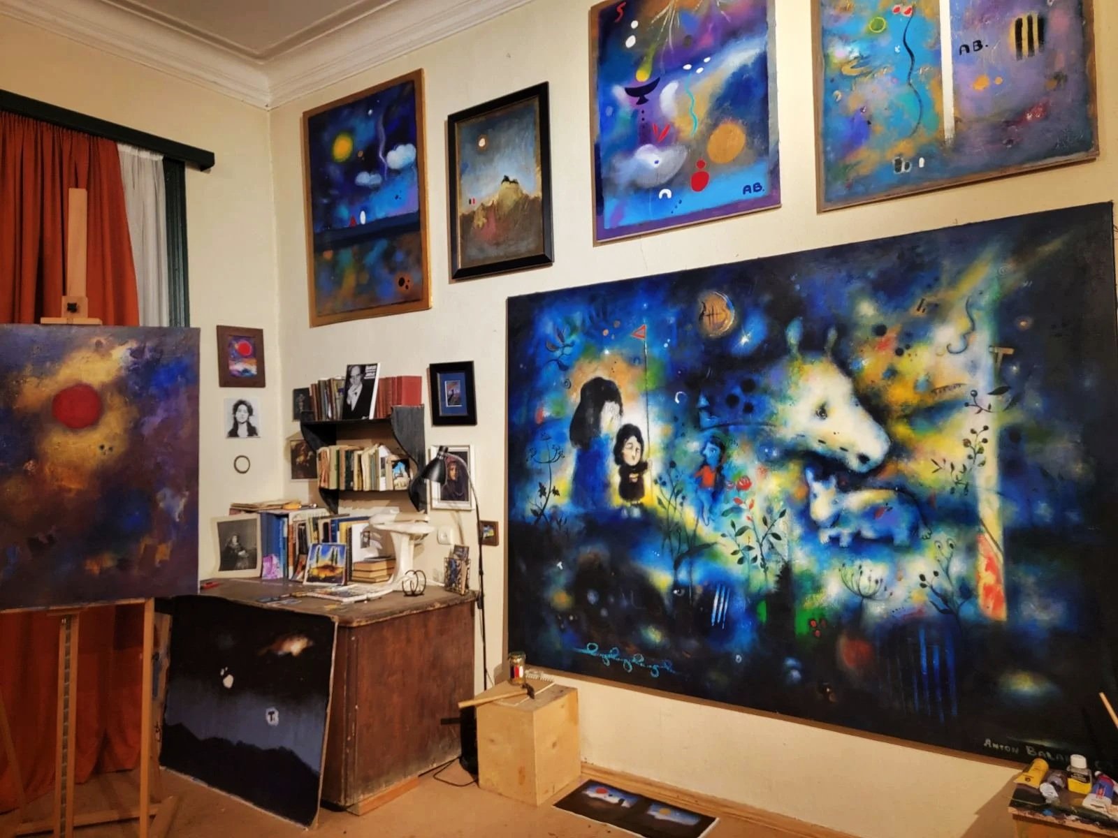 Paintings, unfinished pieces, and everyday objects coexist without order, reflecting the atmosphere in which the work emerged.